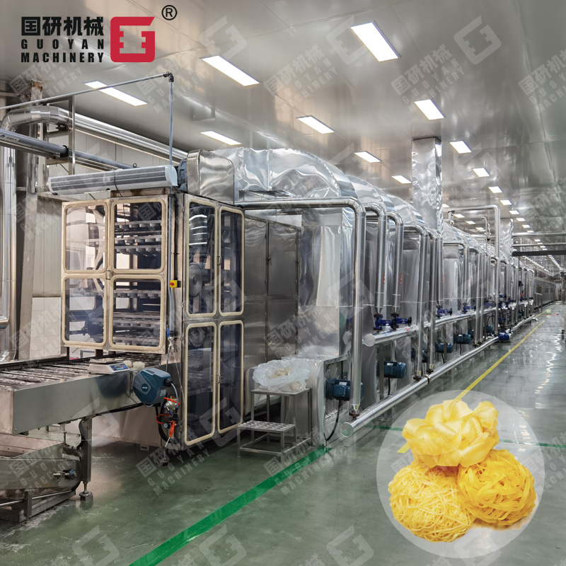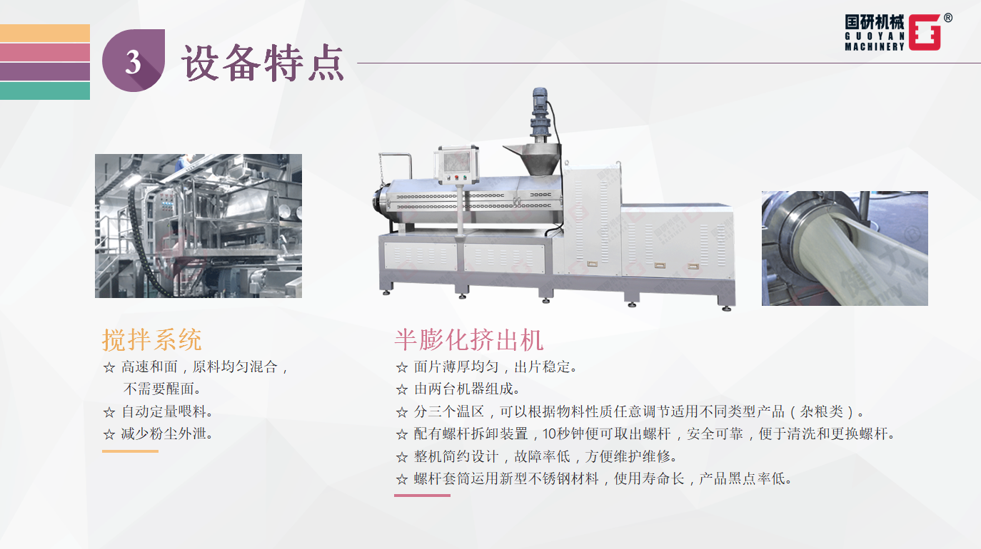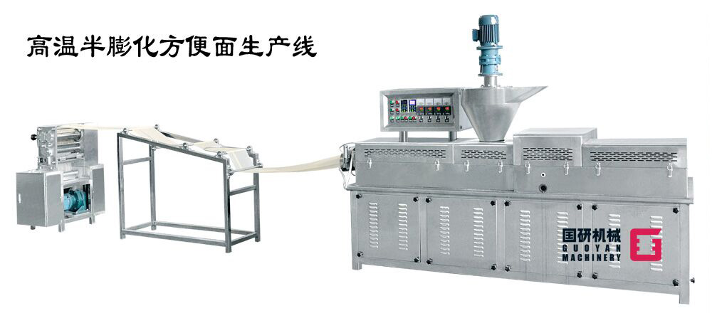 高溫半膨化非油炸方便面生產(chǎn)線,是集自動和面、自動加料、擠壓膨化、面片冷卻輸送、自動切條、分行輸送自動提升、加濕回軟切斷、自動落盒成形、自動干燥到成品輸送入包裝于一體的全自動生產(chǎn)線。該設(shè)備主要應(yīng)用于擠出式非油炸快食面的生產(chǎn),工藝流暢、功能齊全、自動化程度高,機器出品穩(wěn)定,工藝技術(shù)強于國內(nèi)同類生產(chǎn)設(shè)備,是油炸方便面廠家更新?lián)Q代的理想選擇。
